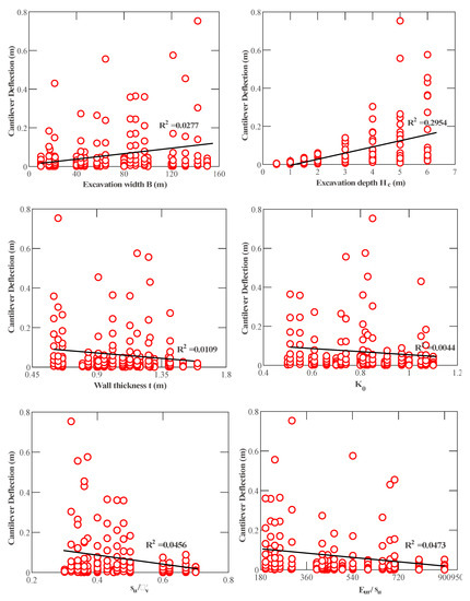 A parametric study was further conducted to evaluate the influences of different input parameters on the cantilever wall deflection. For this purpose, in the following analyses, each input parameter was changed from the minimum to the maximum values according to the database in Table 1, while the other parameters corresponded to the mean values. However, it is noted that the influences of multiple variations of different input parameters on the cantilever wall deflection were not studied in this section.