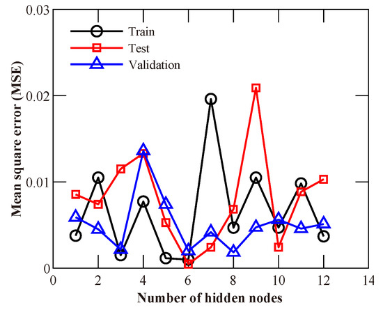 Second, the collected database was randomly spilt into training, testing, and validation sets, respectively. The training ratio was set as 0.70, while the testing and validation ratios were set as equal, i.e., 0.15, respectively. The training set was utilized to compute the associated weights matrix and the biases vector in Equation (2), and the testing set was used to evaluate the performance of the ANN model. Furthermore, the validation set was used to monitor ANN model overfitting. The error of validation data will increase accordingly once overfitting occurs.