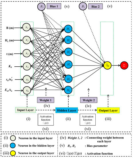 For the application of the developed ANN model to practical problems, the current form of ANN can be converted into an explicit mathematical equation. Based on the procedures discussed in the above sections, the formula for calculating the cantilever wall deflection δ can be obtained directly from the proposed ANN model by utilizing its weights, biases, activation functions, and normalization factors. The normalized cantilever wall deflection δN is a function of six considered input parameters presented in Figure 7. The above procedures are further illustrated in the Equations (8) and (9) as below: