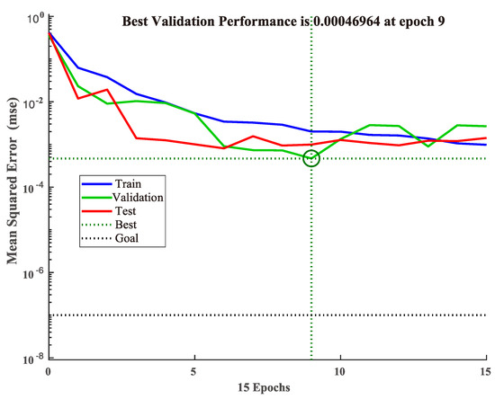 Figure 8 shows the performance of the proposed ANN model. As can be seen in the figure, the MSE for training, testing, and validation decreases rapidly as the number of epochs increases. The minimum MSE is reached at the ninth epoch with a value of 4.6964 × 10−4, indicating that the performance of the proposed ANN model is good.