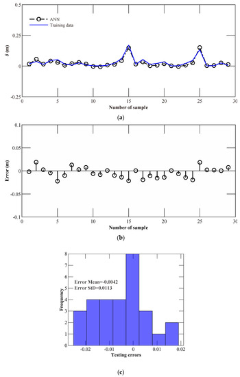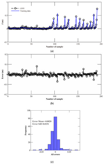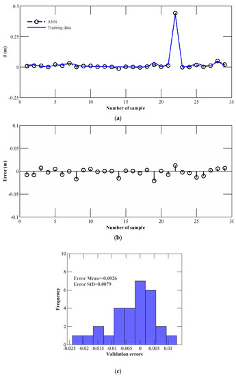 Figure 9a compares the cantilever wall deflection derived from the proposed ANN model with the actual numerical data in the training process. In general, there is a fairly good agreement between the two datasets. Figure 9b shows the evolution of the error with the change in the number of samples. The histogram of the error values with the mean and standard deviation (StD) during the training is also shown in Figure 9c. It can be seen that most of the errors during the training process are close to 0. A similar phenomenon was also observed when comparing the results of the ANN model and the corresponding numerical data for the testing and validation, as well as for all data (see Figure 10, Figure 11 and Figure 12). The above results confirm the effectiveness of the developed ANN model and show that it is reliable in predicting the cantilever wall deflection in undrained clay.