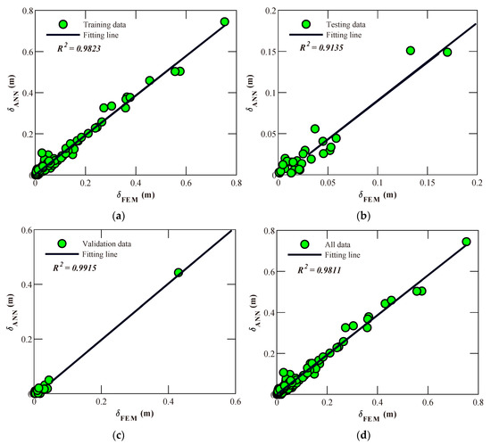 Furthermore, the actual values of the cantilever wall deflection δ were compared with the values predicted by the ANN model using the regression analysis, as shown in Figure 13. It can be observed that the values of R2 for the training, testing, validation, and all data are 0.9823, 0.9135, 0.9915, and 0.9811, respectively. They are all quite close to 1, which again indicates the acceptable performance of the developed ANN model.