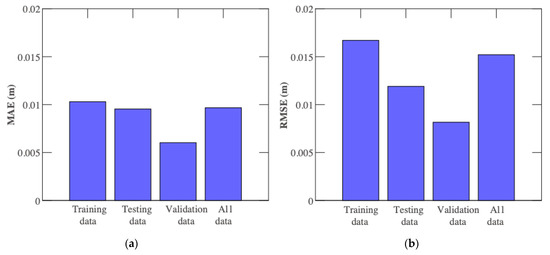 Two commonly used performance indicators, root mean square error (RMSE) and mean absolute error (MAE), were selected to evaluate the network performance. The expression for each indicator is given in Equations (5) and (6). The value of the MAE represents the absolute differences between the predicted and actual values, while the RMSE represents the existing deviation between the predicted and actual values. The results of two indicators for training, testing, validation, and all data are shown in Figure 14. This again demonstrates that the predicted cantilever wall deflection using the developed ANN model were quite similar to the actual values. These results confirm that the developed ANN model performs well and could be successfully used to coherently predict the cantilever wall deflection in undrained clay. Equations (5) and (6) are calculated as follows: