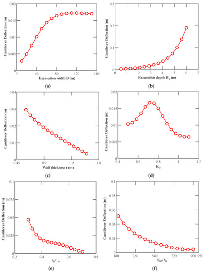 Figure 15a–f present the influence of six input parameters on the cantilever wall deflection. It is obvious that the cantilever wall deflection is increased as the parameters of the excavation width B, and the excavation depth Hc changed from the minimum and the maximum values, as shown in Figure 15a,b. For the parameter of the at-rest lateral earth pressure coefficient K0, the cantilever wall deflection was found to increase slightly as K0 varied from the minimum and the mean values, while it was decreased significantly as K0 increased from the mean to the maximum values. For the other three parameters of the wall thickness t, the soil shear strength ratio at mid-depth of the wall su/σv and the soil stiffness ratio at mid-depth of the wall Eur/su, the cantilever wall deflection was decreased as they increased from the minimum and the maximum values, as presented in Figure 15c,e,f. The above observations highlighted that all the considered input parameters had moderate effects on the cantilever wall deflection.