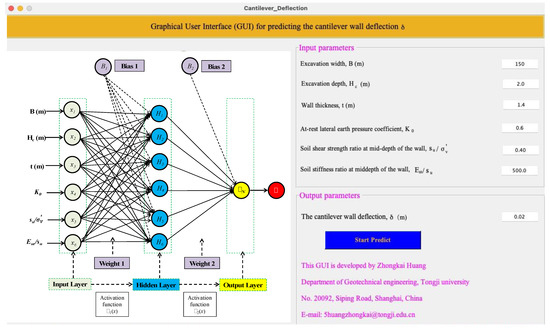 In recent years, geotechnical engineers have paid more attention to the development of user-friendly and practical software, because the complex mathematical equations are usually challenging for practitioners. Therefore, a graphical user interface (GUI) tool was established by MATLAB [31] to predict the cantilever wall deflection δ in undrained clay, as shown in Figure 17. In accordance with the proposed ANN model, six considered input parameters, i.e., from X1 to X6, are presented in this tool. People can input the values for the excavation width B, the excavation depth Hc, the wall thickness t, the at-rest lateral earth pressure coefficient K0, the soil shear strength ratio at mid-depth of the wall su/σv, and the soil stiffness ratio at mid-depth of the wall Eur/su. After entering the input parameters, the cantilever wall deflection δ is immediately displayed when you click on the Start Predict button. In addition, it should be noted that the scope of the developed ANN and this GUI tool is limited to the lower and upper bound of these six input parameters because the ANN model is generally not accurate for extrapolation [25].