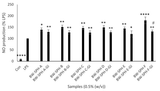 The activation of macrophages is an important part of initiating defensive reactions ensuring effective innate and adaptive immunity. As observed in Figure 1, exposure of RAW264.7 cells to the endotoxin LPS for 24 h upregulated generation of the inflammatory mediator NO, compared with the untreated control (p < 0.0001). Figure 1 also demonstrates that all BWSPHs and SGID BWSPHs (0.5% (w/v dw)) increased NO production in LPS-induced RAW264.7 cells compared with the LPS control (p < 0.05). The NO producing ability of BW-SPH-F was the only hydrolysate which was significantly reduced by SGID (p < 0.05).
