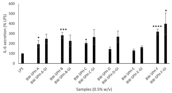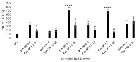 Upon exposure to invasive species, pathogen-recognition receptors (PRRs) of immune cells stimulate numerous signalling cascades resulting in the upregulation of inflammatory cytokines such as TNF-α and IL-6. TNF-α controls inflammatory response through upregulation of proinflammatory cytokines IL-6 and IL-1β as well as through the upregulation of endothelial cell adhesion molecules inducing leukocyte extravasation [50,51]. IL-6 plays an important role in immunity through terminal differentiation of B cells into immunoglobulin-secreting cells as well as regulating the balance between regulatory T cells and Th (T helper) 17 cells [52,53]. No signal for IL-6 or TNF-α protein expression was detected in untreated controls indicating DMEM and FBS were endotoxin free (data not shown). In addition to increasing NO production, hydrolysates BW-SPH-A, -B, -C and -F also increased IL-6 production in LPS-stimulated cells (p < 0.05), with hydrolysates BW-SPH-C, -D, and E increasing levels of TNF-α compared with the LPS control (p < 0.05). This immunostimulation is likely to be lost as the hydrolysates transit the gut, as SGID data show that BW-SPH-F-GI was the only digest to enhance IL-6 and TNF-α cytokine levels in LPS-activated macrophage (p < 0.05) (Figure 2 and Figure 3) compared with the LPS control, indicating the release of immunostimulant peptides from BW-SPH-F during the digestion process. Arithmetical ranking demonstrated that BW-SPH-F and BW-SPH-F-GI were the highest-ranking hydrolysates of the BWSPHs and SGID BWSPHs tested with respect to individual immunomodulatory parameters (Supplementary Table S4). No relationship between free amino acid content [26] and the immunomodulatory effect of BW-SPH-F-GI was observed, suggesting a role for peptides in its bioactivity.