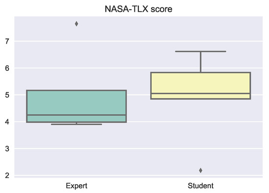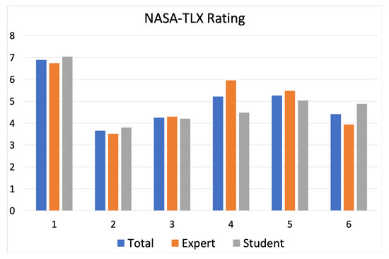 Comparison of the NASA-TLX rating raw score for students, experts.