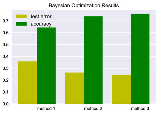 Histogram of Bayesian optimization results for CNN from different feature selections. In this figure, method 1 represents the selection of statistic-based feature and wavelet-based features, method 2 represents the selection of HOC-based features, and method 3 represents the selection of statistic-based feature, wavelet-based features and HOC-based features.