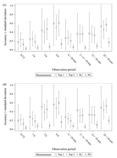 In Figure 3a–d, the results of comparison 2 (comparison between the observation periods of the same kind and length) are displayed. Here, the mean accuracy scores range from 0.05 to 0.47. Analogous to the comparison 1, the initiating tail-biting behaviour produces slightly better accuracy scores. Additionally, the measurement PA produces the best accuracy scores for observation periods of 1 h or shorter.