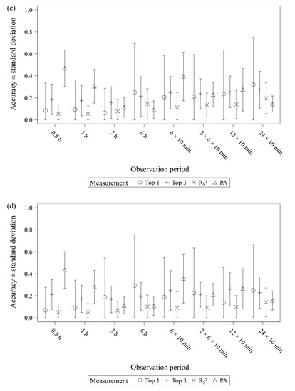 However, the question is whether it is possible to distinguish between bad, moderate or good accuracy. Or whether it is possible to determine a required minimum analysis time per day, bearing in mind that it is unusual for studies on biting behaviour to observe animals for longer than 2 h per day [13,14,15,16,17,18]? There are defined thresholds for the evaluation of correlation coefficients [2]. Applying them to RS², an accuracy score between 0.16–0.49 results in moderate accuracy, between 0.49–0.81 in good accuracy and an accuracy score above 0.81 results in very good accuracy. If these thresholds are applied to the other measurements of accuracy as well, no observation period would exceed the threshold for very good accuracy on average. Moreover, not all observation periods of a total analysis time of 2 h or longer would exceed the threshold for good accuracy on average. For the measurement PA, only mean accuracy scores of the observation periods longer than 4 h would produce a moderate accuracy. Thus, the ranking order could be estimated with an at least moderate validity, whereas the amount of behaviour shown could not be estimated with an at least moderate validity except for the longest tested observation periods.