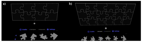 (a) The low-complexity task with 8 pieces of the VR Jigsaw game; (b) the high-complexity task with 18 pieces of the VR Jigsaw game.
