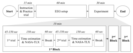 Time estimation refers to the process by which an individual subjectively judges duration. Two categories of time estimation have been defined. In the prospective time estimation paradigm, participants are informed that they are required to estimate duration prior to starting a task; in contrast, in the retrospective time estimation paradigm, participants are not informed that they are required to estimate duration prior to starting a task. Both paradigms ask participants about duration after the task [4,5]. Due to the limitations of the experimental settings in which participants surmise that they may be asked to judge duration, prospective time estimation has been used more widely in studies than retrospective time estimation [5]. Prospective time estimation is explained by the attention allocation model that fewer resources are available for processing time estimation when other cognitive tasks require more attentional resources [6,7,8].
