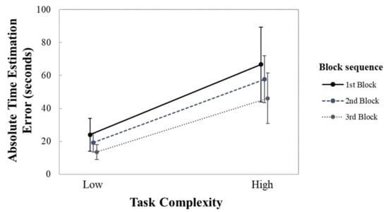 To investigate the impact of the independent variables on the absolute time estimation error, we conducted a repeated-measures ANOVA. Figure 3 presents the interaction plot with the absolute time estimation error. We found a significant effect of task complexity on the absolute time estimation error (F (1, 140) = 82.02, p < 0.001), meaning that the more complex the task was, the larger the absolute error in time estimation was. The effect of the sequence of blocks on the absolute time estimation error was also significant (F (2, 140) = 4.60, p < 0.05). Fisher’s least significant difference (LSD) post hoc analysis indicated that all three blocks differed significantly. Participants made larger time estimation errors in the first block than in the second block, larger errors in the second block than in the third block, and larger errors in the first block than in the third block. There was no significant effect of interaction between task complexity and block sequence on the absolute time estimation error.