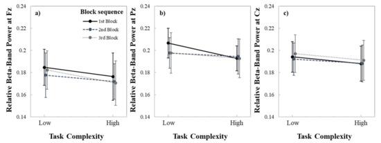 Interaction plots with the relative beta-band power at (a) Fz, (b) Pz, and (c) Cz (task complexity x block sequence). Error bars denote 95% confidence intervals.