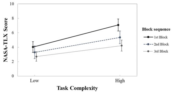 We conducted a similar repeated-measures ANOVA on the subjective workload scores. We found a significant main effect of task complexity on the NASA-TLX score (F (1, 140) = 123.89, p < 0.001). As illustrated in Figure 5, high task complexity generated a higher NASA-TLX score: participants perceived a higher workload in the high-complexity task than the low-complexity task. The sequence of blocks also significantly impacted the NASA-TLX score (F (2, 140) = 37.36, p < 0.001). Fisher’s LSD post hoc analysis showed that all three blocks differed significantly. In our study, participants’ perceived workload gradually decreased from the first block to the third block.