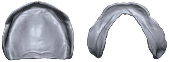 For designing the standard denture base, a fully edentulous maxilla and mandible reference model was selected and then scanned using a tabletop scanner (Identica T500, Medit, Seoul, Korea). After importing the scanned model data into CAD software for dental use (Exocad DentalCAD, Exocad, Darmstadt, Germany), the denture base was designed, and the designed data were exported as an STL (standard tessellation language) file (Figure 1).