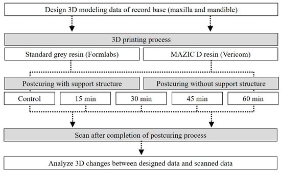 For the purpose of this study, the postcuring time and the removal of the support structure before the postcuring process were set differently for each group. In the no-support group, after 3D printing the denture base, the support structure was removed prior to carrying out postcuring. For the support group, postcuring was performed without removal of the support structure after printing the denture base. In addition to a control group (with no postcuring), postcuring times of 15, 30, 45, and 60 min were employed (n = 10 for each denture base). Data relating to the denture base in all groups were obtained using 3D scanning with a tabletop scanner after postcuring. The overall experimental workflow employed in this study is outlined in Figure 2.