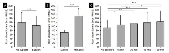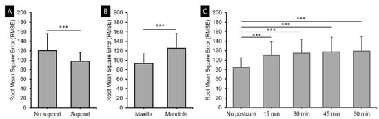 Standard statistical software (SPSS Statistics, version 25.0, IBM Corporation, Armonk, NY, USA) was used for the statistical analyses. The Shapiro–Wilk test was performed to confirm that the data in each group conformed to a normal distribution. Three-way ANOVA was used to evaluate the effect of the presence or absence of a support structure during postcuring, arch position (maxilla or mandible), and postcuring time on the RMSE values between the modeling and scanned data. One-way ANOVA was used to test dimensional changes within the same arch and materials based on the postcuring time, and a post-hoc test was performed using the Bonferroni method (α = 0.05). Differences between the support and no-support groups according to time in the same arch and the same material were analyzed using Student’s t-test (α = 0.05).