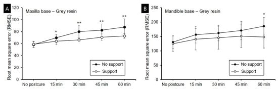 RMSE values during the postcuring process in the no-support and support groups using standard gray resin. (A) Maxilla base. (B) Mandible base. Data are mean and standard deviation values. *, p ≤ 0.05; **, p ≤ 0.01 between the no-support and support groups.