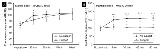 RMSE values during the postcuring process in the no-support and support groups using MAZIC D resin. (A) Maxilla base. (B) Mandible base. Data are mean and standard deviation values. *, p ≤ 0.05; ***, p ≤ 0.001 between the no-support and support groups.