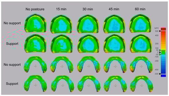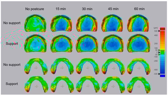 When using MAZIC D resin and a DLP 3D printer, continuous errors were observed in the maxilla regardless of the postcuring time or presence of a support structure. The larger error for the maxilla than for the mandible was attributed to the large error in the palate area. The palate of the maxilla can play a role in maintaining the dimensional stability of the fabricated object, such as a support structure used in the 3D printing process does, but unlike the support structure, it is an area that is used without being removed. Hwang et al. [] recently found both positive and negative errors in the maxillary palate for maxillary denture bases produced using the DLP 3D printer, which is similar results to this present experiments. Those authors attributed the geometry deviations to the 100-degree construction angle and sagging of the liquid material under its own weight. This analysis can be supported through the result that palate error is small even in the milled type manufacturing method [,]. In addition, in the postcuring process, since there may be a difference in the shrinkage between the part that is directly irradiated with UV light and the part that is not directly irradiated with UV light, this may cause bending and lead to an error in the denture base []. In this study, the average RMSE values of standard gray resin and MAZIC D resin were similar, but in the color map shown in Figure 7, it was confirmed that the overall deviation of MAZIC D resin was large. This trend was especially observed in the maxilla, and it can be confirmed through the fact that the standard deviation value of MAZIC D resin is higher than that of standard gray resin in all postcuring time periods.