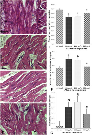 Photomicrograph of myocytes in the atrium of adult frogs, showing the effects of atrazine in the exposure groups. (A) Control, (B) 0.01 µg/L group, (C) 200 µg/L group, and (D) 500 µg/L group, ×1000. Scale bar = 15 µm. (E) “a” and “b” are significantly decreased compared to the control, while “c” is significantly increased compared to “a” but similar to the control in the area of AM (p = 0.0001). (F) “a” and “b” are significantly increased compared to the control, while “c” is not significantly different from the control in the area of AIS (p = 0.003 and 0.014, respectively; Bonferroni post-hoc test). (G) “a,” “b,” and “c” are significantly increased compared to the control (p = 0.0001 and 0.023, respectively), as is “b” compared to “c” (p = 0.004; Dunn’s pairwise test, adjusted using Bonferroni correction) in the semiquantitative scoring of atrial waviness. AIS: % area fraction of atrial interstitial space; AM: % area fraction of atrial myocyte.