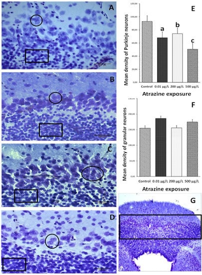 The mean density of Purkinje cells decreased in all atrazine-treated groups, but this decrease was significant in the 0.01 µg/L and 500 µg/L groups (Bonferroni’s post-hoc test, p = 0.0001 and 0.01, respectively) (Figure 6E). However, the mean density of the granule cells in the cerebellum did not differ significantly across the treatment groups (Figure 6F).
