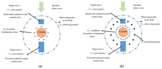 Earlier studies utilized arrays of uniformly distributed secondary loudspeakers [4,5,6,7] to control noise. However, these strategies are limited to relatively low frequencies because of the following reason: as the wavelength of sound becomes smaller or the target area expands, the number of the secondary loudspeakers required to achieve good noise reduction in the target area increases, and the uniformly placed secondary loudspeaker array produces large sound amplification in other areas. In practical applications, the number of secondary loudspeakers and the available power are limited. How to achieve a good scattered sound control performance under the constrained condition is a critical issue that requires resolution [8].