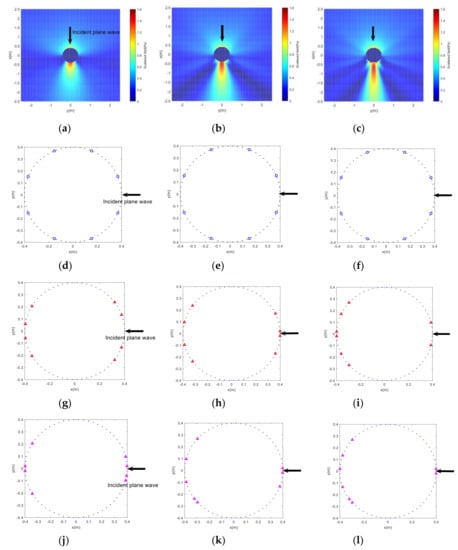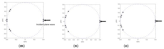 Figure 2d–f shows the uniformly placed secondary loudspeakers and the distribution of the secondary loudspeakers doesn’t change with increasing frequency. Figure 2g–i shows that the selected loudspeakers of the proposed CLASSO-RLS algorithm are mainly distributed in the forward region of the cylinder (near the region of the forward-scattered sound) and the backward region of the cylinder (near the region of the backward-scattered sound). As the frequency increases, there are more secondary loudspeakers in the forward region and the secondary loudspeaker distribution in the backward region becomes more concentrated.