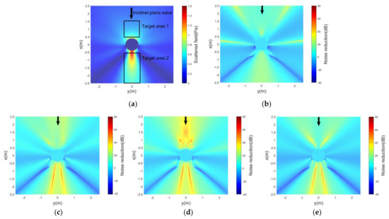 Figure 3a shows that scattered sound power is mainly distributed in the forward-scattered sound area (the target area 2) and the backward-scattered sound area (the target area 1). The goal of the noise control is to obtain large noise reduction in these two areas.