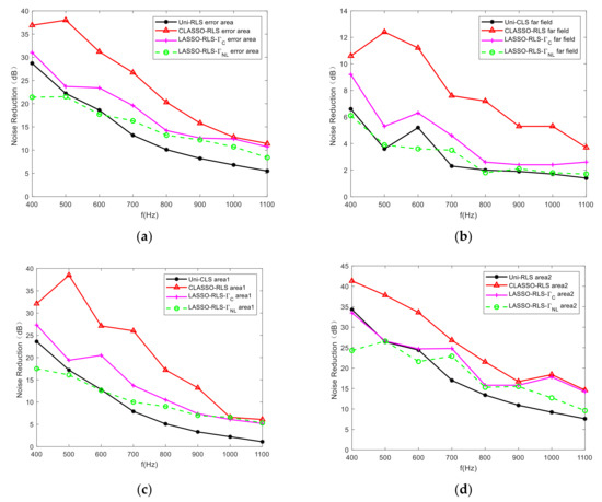 As shown in Figure 4, the noise reduction of each algorithm in the entire target area, target area 1, target area 2, and far-field observation area decreased with increasing frequency. Figure 4a illustrates that from 700 to 1100 Hz, the noise reduction of the three optimized algorithms in the entire target area is 2–13 dB greater than that of the Uni-RLS algorithm because the under-sampling issue of the uniformly placed secondary loudspeakers becomes gradually critical as the frequency increases. In contrast, the secondary loudspeaker spacing of the three optimized algorithms changes with increasing frequency. This provides better cancellation of the scattered sound field, resulting in improved noise reduction performance. Among the three optimized algorithms, the proposed CLASSO-RLS algorithm outperforms the other algorithms. From 400 Hz–1100 Hz, the proposed strategy gains a 5 dB–16 dB reduction performance advantage in the target area compared to the Uni-RLS algorithm.