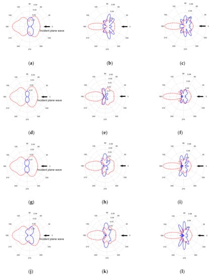 As seen in Figure 5, in the directions where the target areas are located, the blue solid line is smaller than the red dotted line for each method. It illustrates that all algorithms have good noise reduction in the directions of the forward-scattered sound and backward-scattered sound target areas. However, as shown in Figure 5a–c,g–l, in the directions with an angle of 90° from the incident direction, the blue solid lines are bigger than the red dotted lines. It illustrates that Uni-RLS algorithm, LASSO-RLS- method and LASSO-RLS- method exhibit sound amplification after active noise control in the two directions and the sound amplification becomes more apparent with increasing frequency. This is due to the fact that as the frequency increases, the secondary loudspeakers need more power to provide good noise reduction in the target areas. However, as the power increases, the secondary loudspeakers produce larger sound amplification outside the target areas.