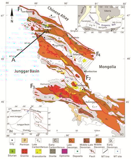 (a) Location of the Junggar terrains in the Central Asian Orogenic Belt. (b) Distribution of the West Junggar, Junggar Basin, and East Junggar. (c) Geological map of the East Junggar showing MT line locations. F1: the Erqis Fault, F2: the Zhaheba-Armantai Fault, F3: the Kelameili Fault, F4: Fuyun Fault (modified from [23]).