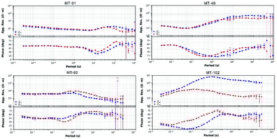 The recorded time series at MT-Stations were transformed from the time domain to the frequency domain by Fourier transform. The robust algorithm was used to compute the magnetotelluric response functions [37]. The robust processing scheme results in a period band ranging from 0.001 to 1000 s are shown in Figure 2. The apparent resistivity and phase curves of MT points in the study area show the different electrical characteristics in different tectonic units. The apparent resistivity and phase curves of MT-01 represent the electrical structure of the Wunlungu Depression, which has low resistivity with typical basin resistivity characteristics. The apparent resistivity and phase curves of MT-40 reveal the electrical structure of the Yemaquan island arc, which has low resistivity in the shallow part and high resistivity in the deep part of the crust. The apparent resistivity and phase curves of MT-80 reveal the electrical structure of the Zhaheba complex, which has the high resistivity in general. The apparent resistivity and phase curves of MT-102 show the electrical structure of the Dulate arc, which has the low-high-medium resistivity.