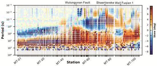 Phase tensors in Figure 4 were calculated to reveal the dimensionality of the subsurface structure [41], which has the advantage of avoiding near-surface conductivity heterogeneity effects. We found most of the stations are of relatively small skew angles (<5°) over different period bands. The shallow part of the study area indicates the smallest skew, while the ellipses of some of the stations approach circles, which represent a 1D character that may be related to surface cover. Larger skew angles for some stations are distributed beneath the Wulungunan fault zone and the shapes of phase tensor ellipses are strong ellipticity, which suggests that the crust is unstable and complex. For the stations beneath the Wulungu Depression, the shapes of phase tensor ellipses are close to round circles, which suggest that the uniform crust in this region is generally of 1D character. The stations beneath the East Junggar Orogenic Belt in longer periods (in 100–1000 s, skew angles >5°) indicate complex subsurface structures in this region. In general, we conclude the dimensionality of the profile is 2D, and 2D inversion procedures are applicable to our dataset.