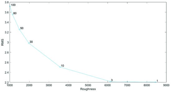 Model roughness and RMS curve (L-curve) obtained by inversion of different regularization.