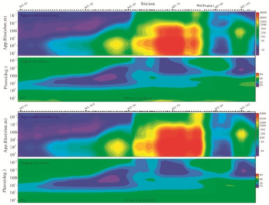 (a) Observed apparent resistivity and phase in pseudo section format for the profile. (b) Response of the 2D model. The similarities between pseudo sections of observed and calculated data prove the final model is reliable.