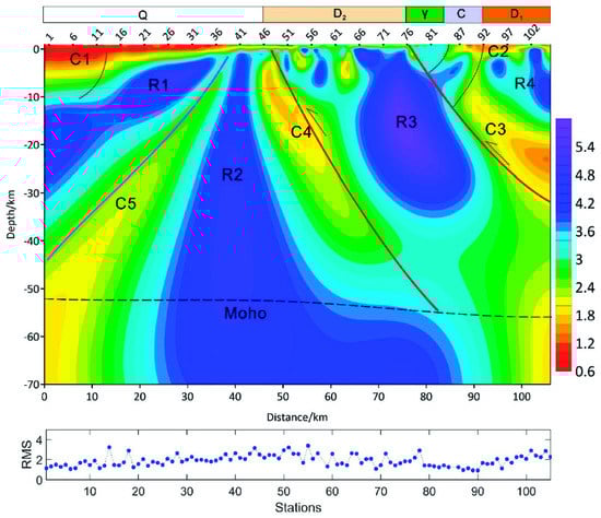 The MT data were decomposed into two independent modes and the TM mode is defined as Transverse Magnetic mode. The TM mode is more sensitive to resistive structures and is more stable under the 3D effects caused by conductors [42]. There are many algorithms in use for regularized 2D inversion of magnetotelluric data. Constable et al. (1987) find nonlinear least-squares solutions subject to a smoothness constraint (OCCAM method) [43]. Siripunvaraporn (2000) present a new and much more efficient variant on the OCCAM scheme, called as REBOCC [44]. Rapid relaxation inversion (RRI) has been developed which can be very fast, but in practice often fails to converge without significant expert user intervention [45]. Rodi (2001) employs a nonlinear conjugate gradients (NLCG) scheme to minimize an objective function that penalizes data residuals and second spatial derivatives of resistivity [46]. Therefore, we inverted the MT data with 2D nonlinear conjugate gradients algorithm. Constable believes that the inversion model should be as simple and smooth as possible, and the roughness should be as small as possible under the condition that the fitting difference meets the requirements, so as to suppress the redundant structure from non-real data [43]. We plotted the RMS curve to determine the roughness regularization parameter (τ), which balances the model roughness with root-mean-square misfits (Figure 5). The RMS curve shows that the best roughness regularization parameter is 10. Then, we invert the TM data with the error floor, for TM apparent resistivity and phase are set to be 10% and 1°. All inversions are started from a 100 Ωm uniform half space. The number of inversion iterations was 200 and the RMS misfit for the final model is 2.16103 in general. The comparison of observed data and response data is shown in Figure 6. It can be seen that data are generally well fit along the profile. Most stations have RMS <3. However, some stations, such as stations 14, 44, 55, and 105 have larger RMS, indicating poor fitting. The RMS values for individual stations (Figure 7) indicate that the highest misfits occur at the Wulungunan fault zone. The RMS misfit value is low and pseudo sections of observed and calculated data are similar. These results indicate a proper fitting and prove the final model is reliable.