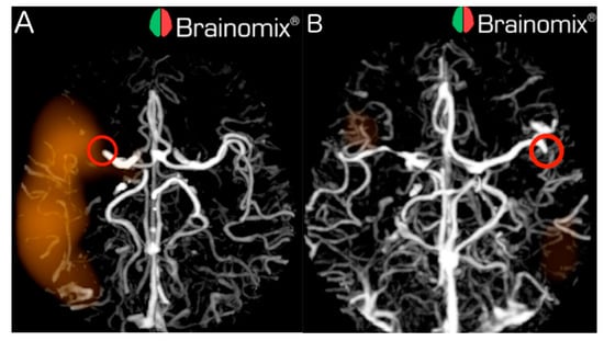 CTAs of stroke patients with LVOs correctly detected by e-CTA. (A) e-CTA detected proximal LVO of the right MCA-M1 (red circle); (B) e-CTA detected distal LVO of the left MCA-M2 (red circle).