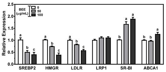 Expression of genes for cholesterol biosynthesis and absorption in BEE-treated HepG2 cells. Cells were treated with 50 or 100 μg/mL of BEE for 24 h. The gene expression was measured by qRT-PCR analysis. Data are expressed as relative expressions to control. Different letters indicate significant differences (p < 0.05). Values are means ± S.E.M. n = 6.
