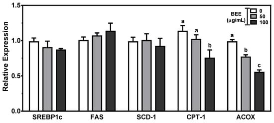 The expression of genes for fatty acid metabolism in BEE-treated HepG2 cells. Cells were treated with 50 or 100 μg/mL of BEE for 24 h. The mRNA abundance was measured by qRT-PCR analysis. Data are expressed as relative expressions to control. Different letters indicate significant differences (p < 0.05). Values are means ± S.E.M. n = 6.