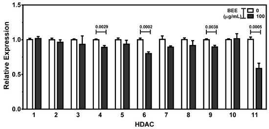 The effects of BEE on the regulation of HDACs in HepG2 cells. The cells were treated with 100 μg/mL of BEE for 24 h. The expression of HDAC isoforms was measured by qRT-PCR. Data are expressed as relative expressions of control. Different letters indicate significant differences (p < 0.05). Values are means ± S.E.M. n = 6.