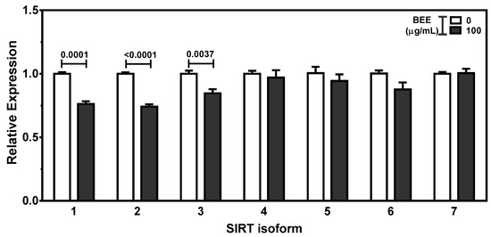 The effects of BEE on the alteration of SIRTs in HepG2 cells. The cells were treated with 100 μg/mL of BEE for 24 h. The expression of SIRT isoforms was measured by qRT-PCR. Data are expressed as relative expressions of control. Different letters indicate significant differences (p < 0.05). Values are means ± S.E.M. n = 6.