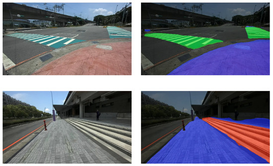 After training, the Fast-SCNN outputs a segmentation result for the image in front of the user to identify sidewalks, crosswalks, stairs, and asphalt roads in their walking path. Figure 3 shows two examples of semantic segmentation results, where the left and right parts are the original capture and its segmentation result, respectively. The green, blue, grey, and red colors represent crosswalks, sidewalks, asphalt roads, and stairs, respectively. Table 3 lists the performance of Fast-SCNN with pixel accuracy and Intersection over Union (IoU).
