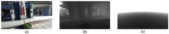 (a) The original image; (b) the real depth map corresponding to the image in (a); (c) the depth map of a completely open area.