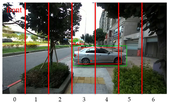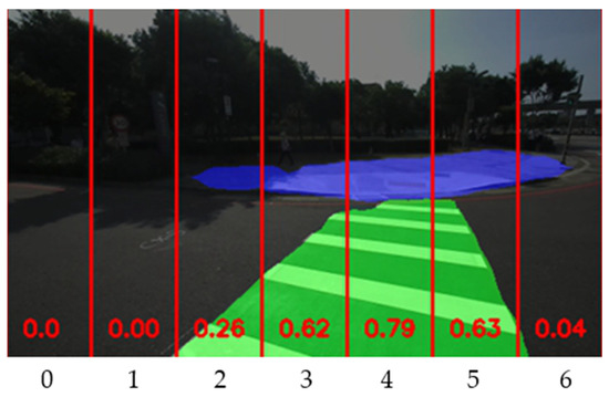 In this study, the semantic segmentation defines the sidewalk and crosswalk with blue and green colors, respectively, as walkable areas. Since the ZED 2 is mounted on the user’s cap and suppose the user’s height is (unit: m). Then the bottom width of the captured image field of view is about meters (when the user looks forward). We split the image evenly into seven divisions from left to right (see Figure 5) and number them from 0 to 6. For example, when the is 1.7 m, each division has a width of about m which is wide enough for a person to go through. We plan to select the most suitable division from these seven divisions to be the suggested direction for guiding the visually impaired user to walk in.