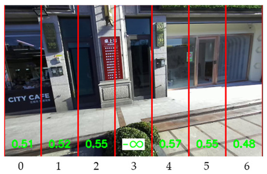 where w(i, j) is the weight and p(i, j) is the pixel value of the position (i, j) in a division. N is the total number of pixels in the division. For instance, the third division from the right in Figure 5 contains large green and blue areas, so its confidence degree is 0.79, the largest in the seven divisions. The rightmost division has a tiny green area, so its Confs = 0.04 is very low. In other words, the direction shown in the third division from the right is most walkable.