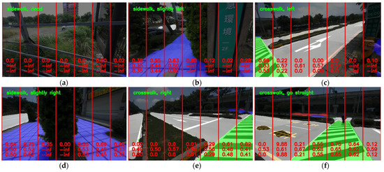 Based on (5), we have three confidence degrees on the bottom of each division, as shown in Figure 7, where the first, second, and third rows denote the values of Confs, Confd, and Conf, respectively. The Conf value will be the critical value to determine the walkability confidence index of each division. For instance, in image (a) of Figure 7, there is no sidewalk or crosswalk, almost all divisions with Confs = 0, and there are close balusters in front of the user, then all divisions with Confd = . In the second division from the left of image (d), there is a small area with blue color (it denotes the sidewalk), then Confs = 0.35 in that division, and there is a tree close to the user, then the division with Confd = .