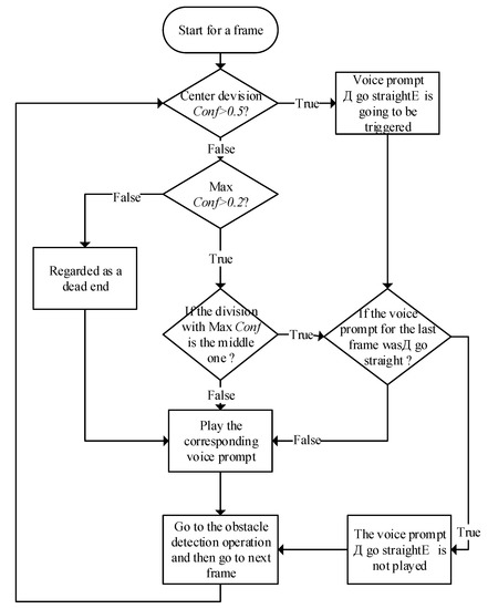 Case 1: If the Conf > 0.5 in the middle division, then the middle division is chosen, and the voice prompt gives the instruction “go straight.” Otherwise, check Conf in all divisions and go to Case 2.